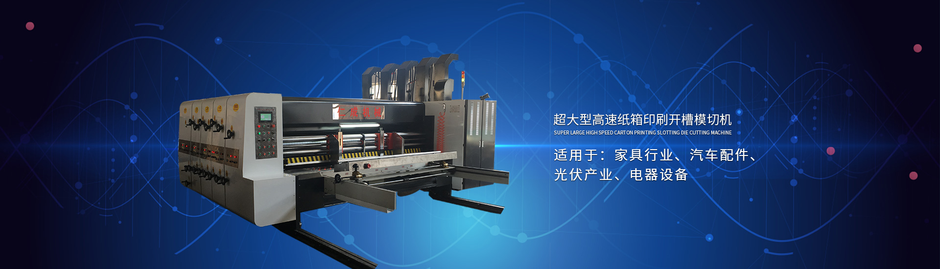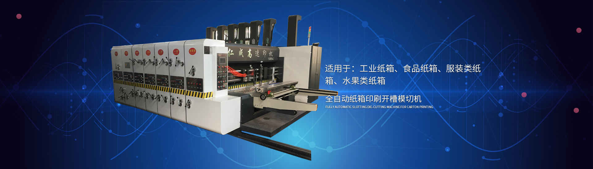 主要產(chǎn)品有高速印刷開槽模切機(jī)、半自動(dòng)水墨印刷開槽模切機(jī)、全自動(dòng)粘箱打包聯(lián)動(dòng)線、全自動(dòng) 插格機(jī)、半自動(dòng)粘箱機(jī)、半自動(dòng)釘箱機(jī)、手動(dòng)釘箱機(jī)、薄刀分紙機(jī)、PE繩打包機(jī)、PP帶智能打包 機(jī)、圓壓圓模切機(jī)、平壓壓痕機(jī)、自動(dòng)裱紙機(jī)、水墨污水處理機(jī)等產(chǎn)品